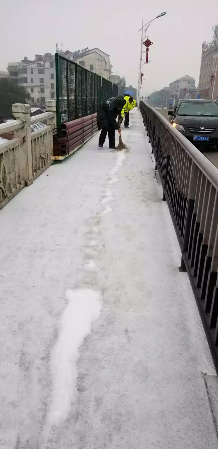 屈原桥是穿越城东和城西的一座大桥,属于结冰高危路段,车辆、行人通行,安全第一,汨罗城管加大重点区域、重点路段清扫力度,确保车辆和行人雪中通行安全。