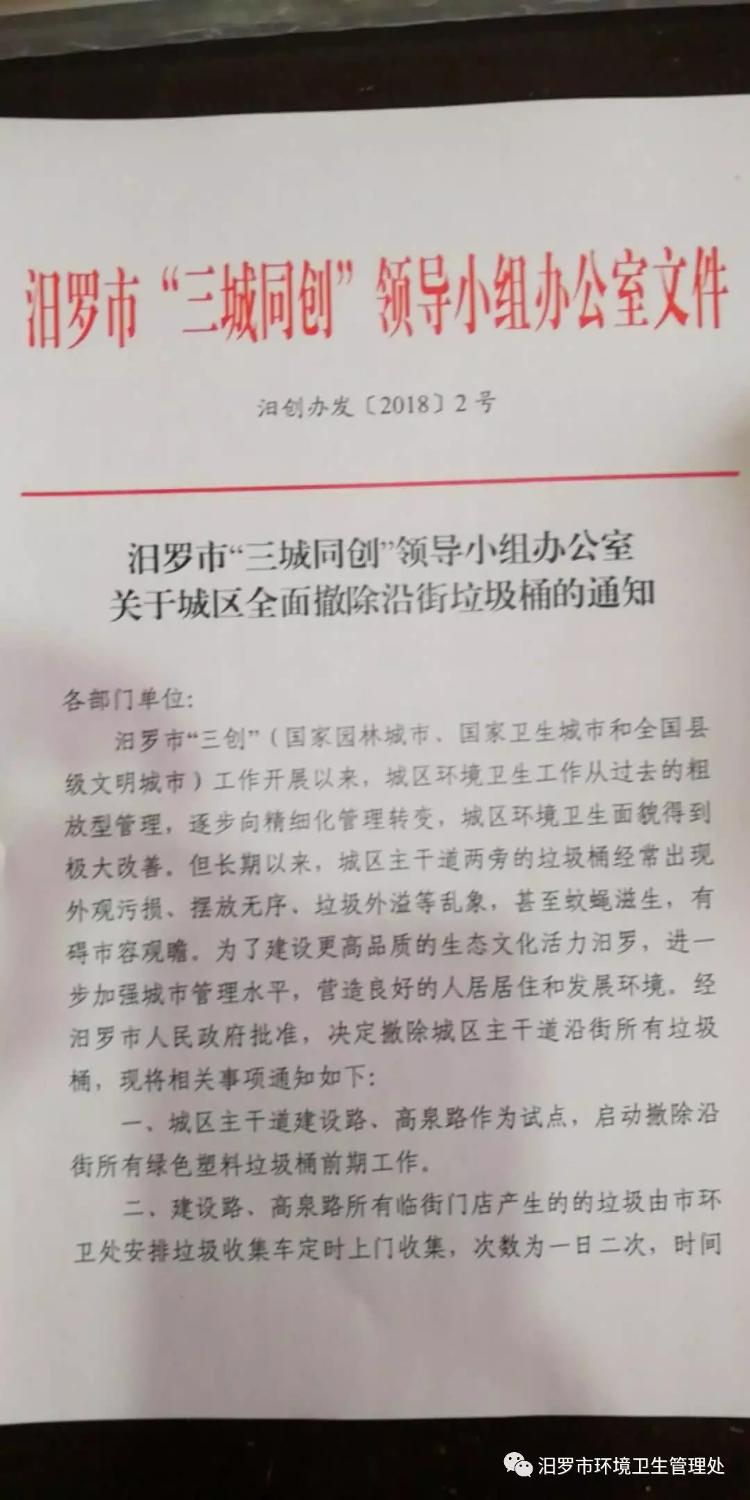 1月30日,汨罗市“三城同创”领导小组办公室已经全面启动城区高泉路、建设路沿街绿色垃圾桶撤除工作。