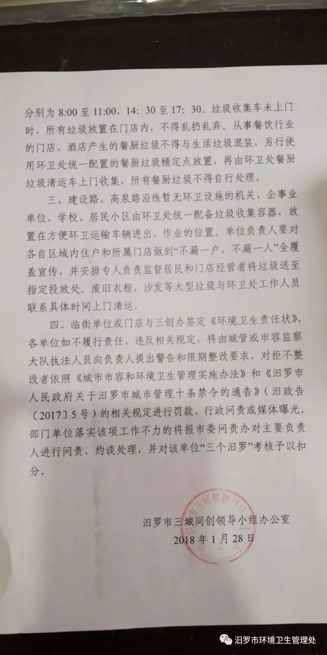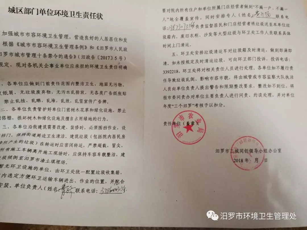 清早,“三创办”和市环卫处工作人员将《告知书》等宣传资料送至沿街各门店和部门单位,签订了《环境卫生责任状》,明确了责任。