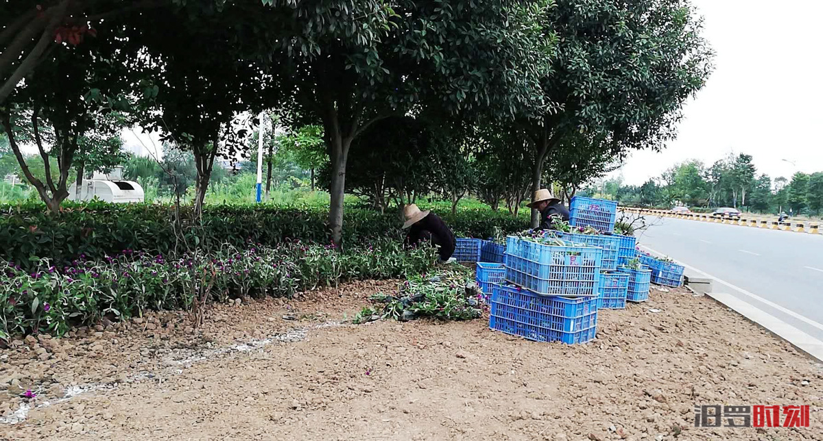 当天,记者在汨罗江大桥附近的绿化带看到,园林工人正加快进度,进行草花的栽种。