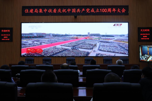 7月1日上午,局党组召集机关全体党员在五楼媒体会议室收看党中央在天安门举行的建党百年庆祝大会实况,聆听党中央总书记习近平同志的重要讲话。收看完中央大会实况后,组织老党员乘专车观礼城市建设百年辉煌成就现场,并在局机关食堂举行午宴。