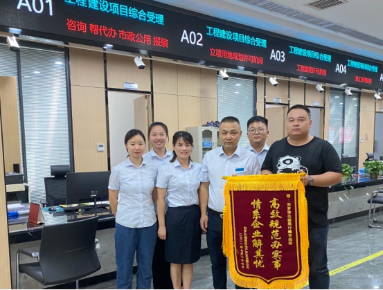 7月28日上午,汨罗山湖海房地产开发有限公司将一面绣着“高效规范办实事,情系企业解其忧”的锦旗送到了汨罗市住建局行政审批股,对汨罗市住建局行政审批股良好的营商环境和高速的办事效率表示非常满意和感激。