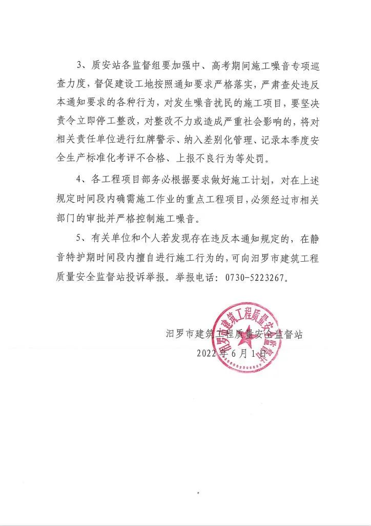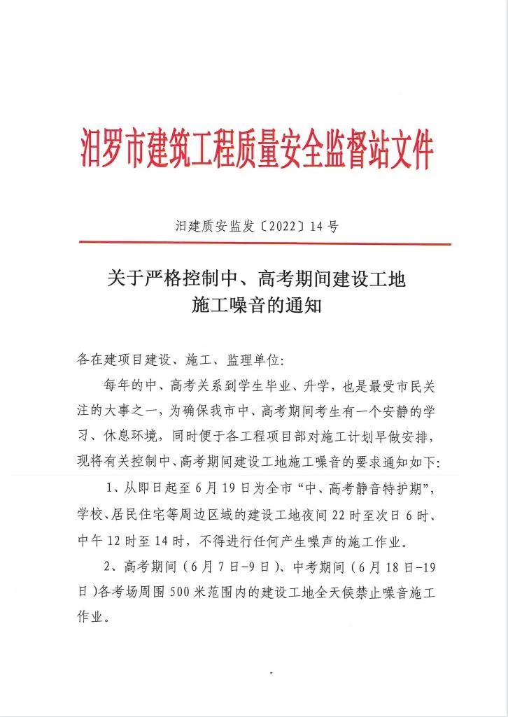 为营造中高考期间安静的学习、考试环境,严格控制建筑工地噪声污染,市住建局建工中心要求各建筑工地严格控制施工噪音,“中、高考静音特护期”(6月1日-6月19日)期间,学校、居民住宅等周边区域的建设工地夜间22时-次日6时、中午12时-14时,不得进行任何产生噪声的施工作业;高考期间(6月7日-9日)、中考期间(6月18日-19日),各考场周围500米范围内的建设工地全天候禁止产生噪音的施工作业,全力护航中、高考!
