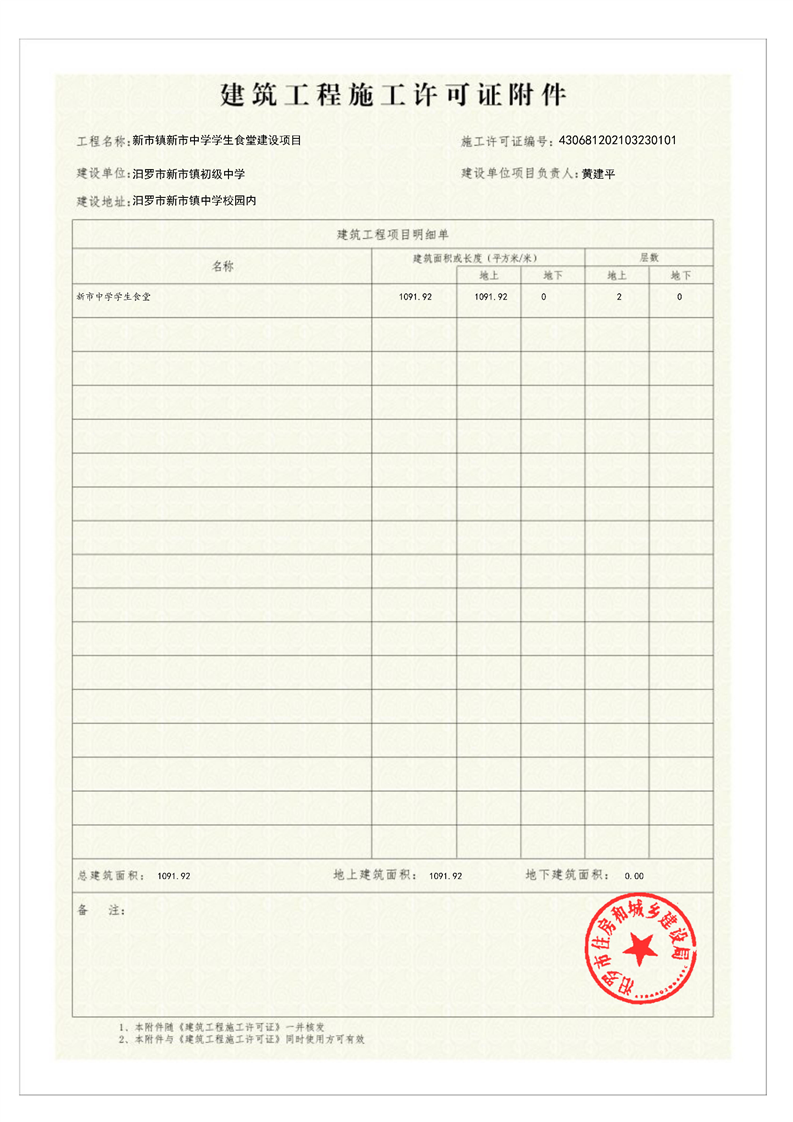 汨罗新市镇初级中学新市镇新市中学学生食堂建设项目施工许可证