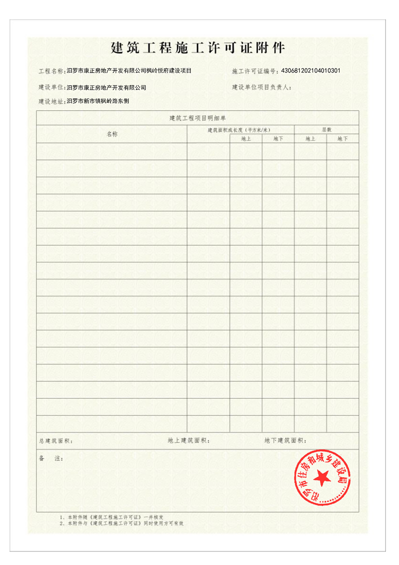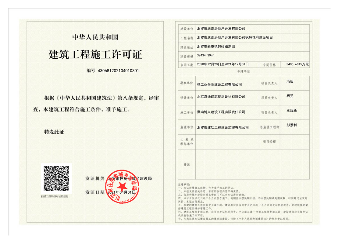 汨罗市康正房地产开发有限公司枫岭悦府建设项目施工许可证