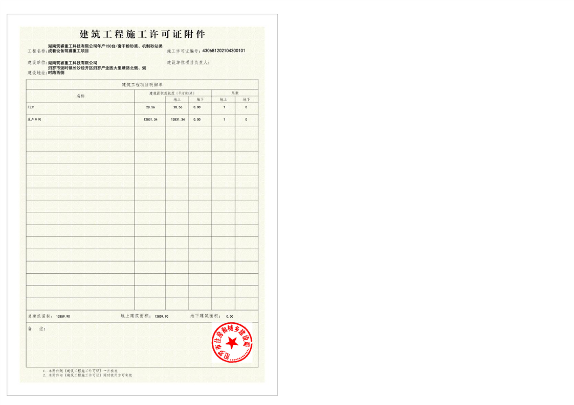 湖南筑睿重工科技有限公司年产150台套干粉砂浆、机制砂站类成套设备筑睿重工项目施工许可证