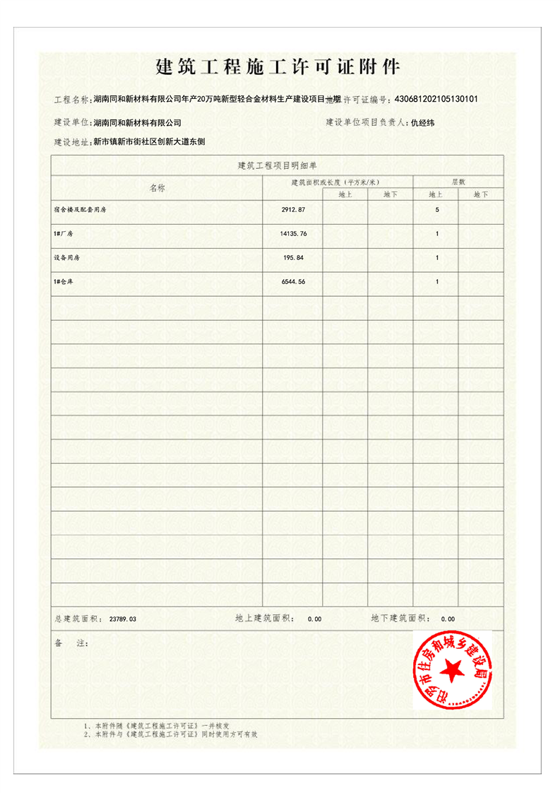 湖南同和新材料有限公司年产20万吨新型轻合金生产建设项目一期施工许可证