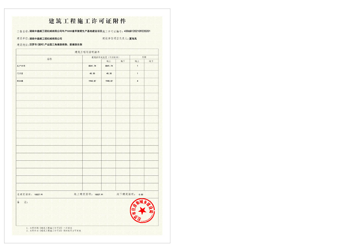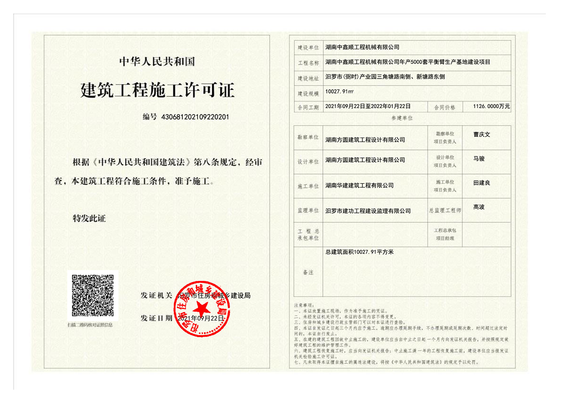 湖南中鑫顺工程机械有限公司年产5000套平衡臂生产基地建设项目施工许可证
