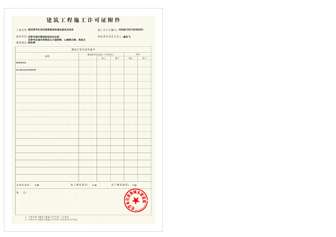 原汨罗市生活垃圾填埋场防渗改造试点项目施工许可证