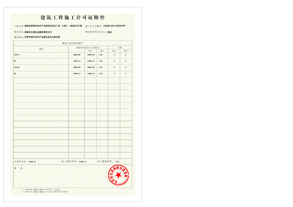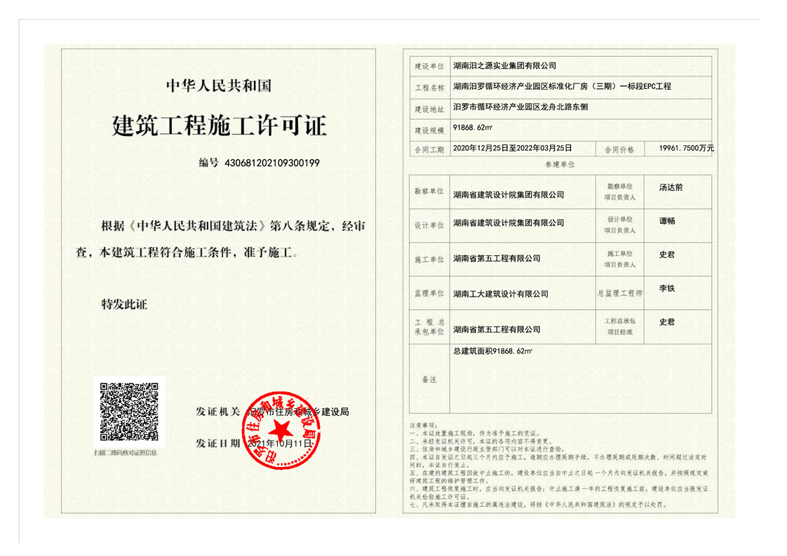 湖南汨罗循环经济产业园区标准化厂房(三期)一标段EPC工程施工许可证