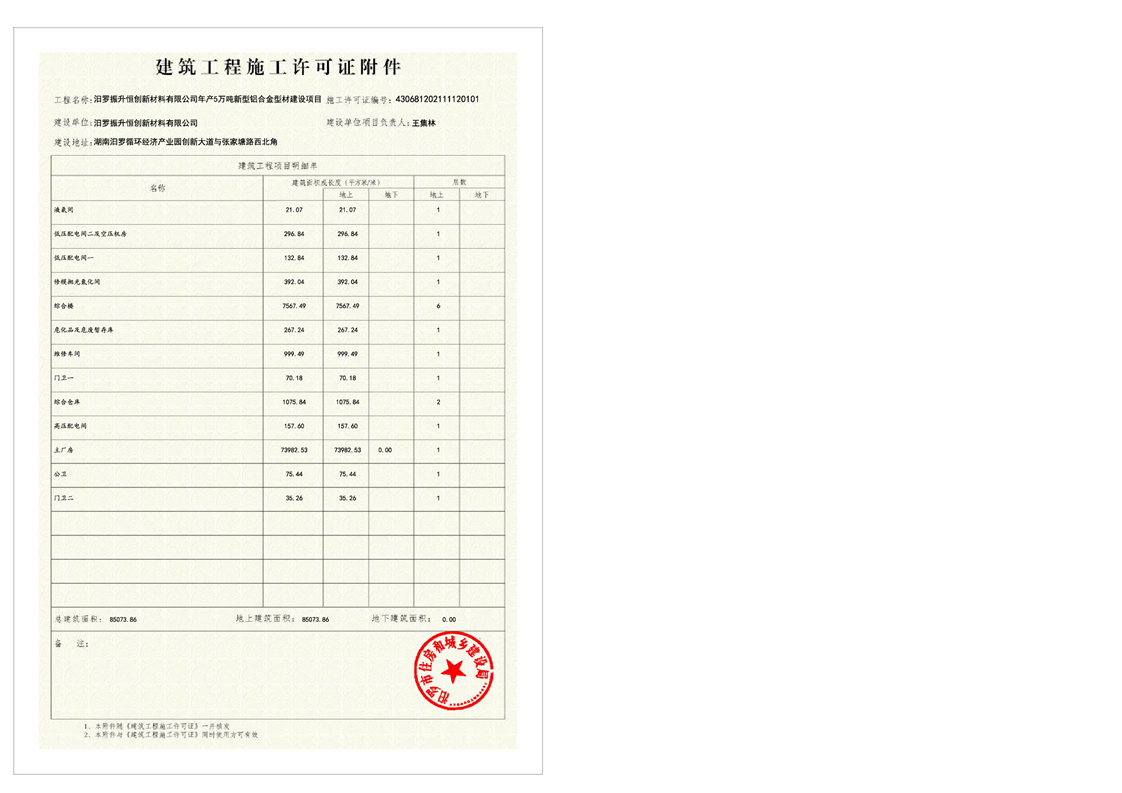 汨罗振升恒创新材料有限公司年产5万吨新型铝合金型材建设项目施工许可证