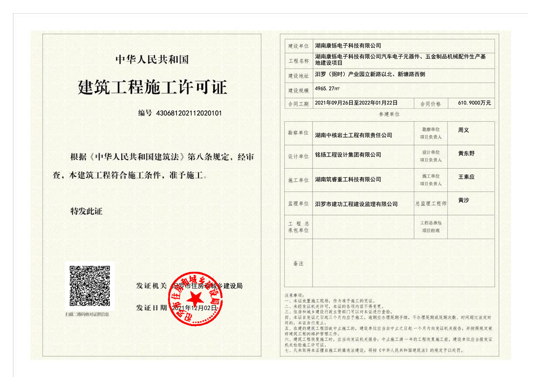 湖南康铄电子科技有限公司汽车电子元器件、五金制品机械配件生产基地建设项目施工许可证