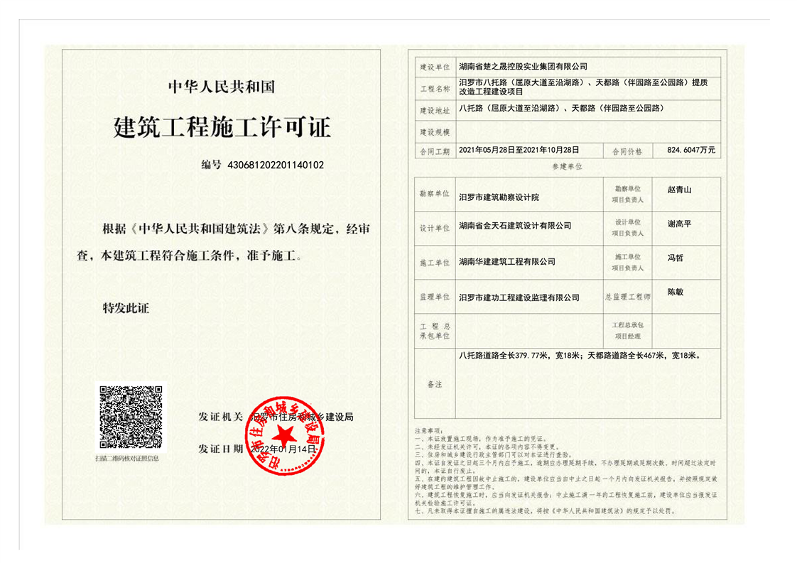 汨罗市八托路(屈原大道至沿湖路)、天都路(伴园路至公园路)提质改造工程建设项目施工许可证