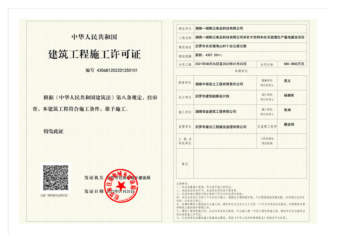 湖南一碗陈记食品科技有限公司米乳牛饮料和长乐甜酒生产基地建设项目施工许可证