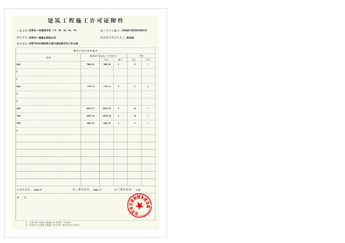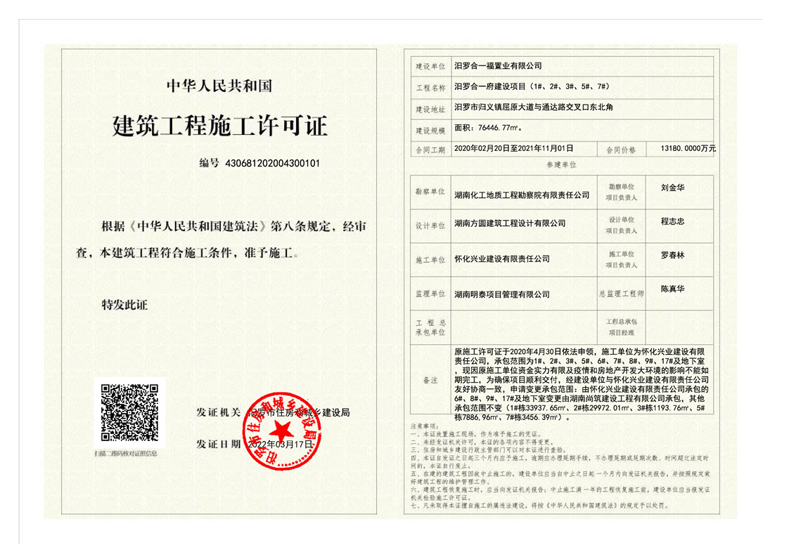 汨罗合一府建设项目(1#、2#、3#、5#、7#)施工许可证变更