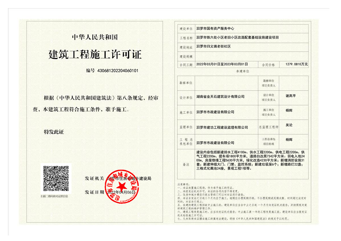 汨罗市铁六处小区老旧小区改造配套基础设施建设项目施工许可证