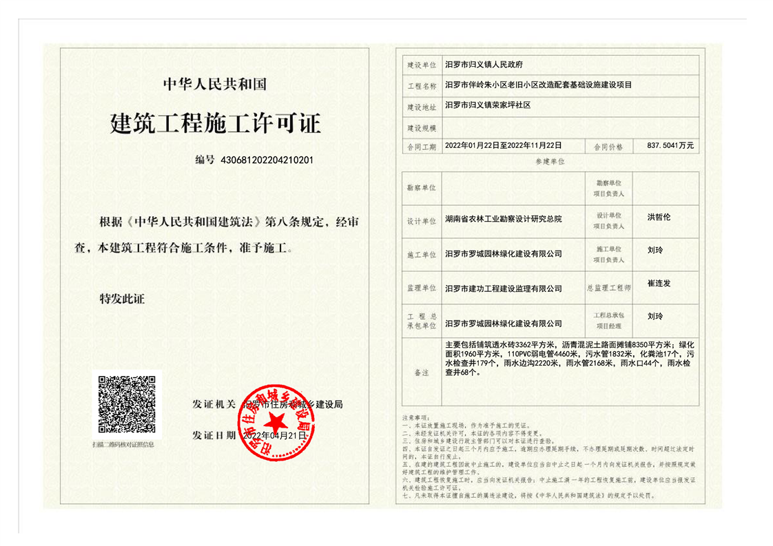 汨罗市伴岭朱小区老旧小区改造配套基础设施建设项目施工许可证