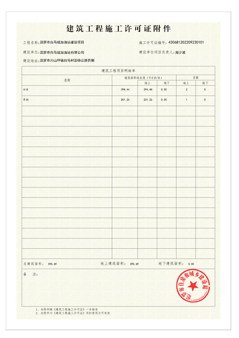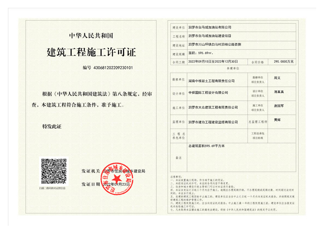 汨罗市白马城加油站建设项目施工许可证