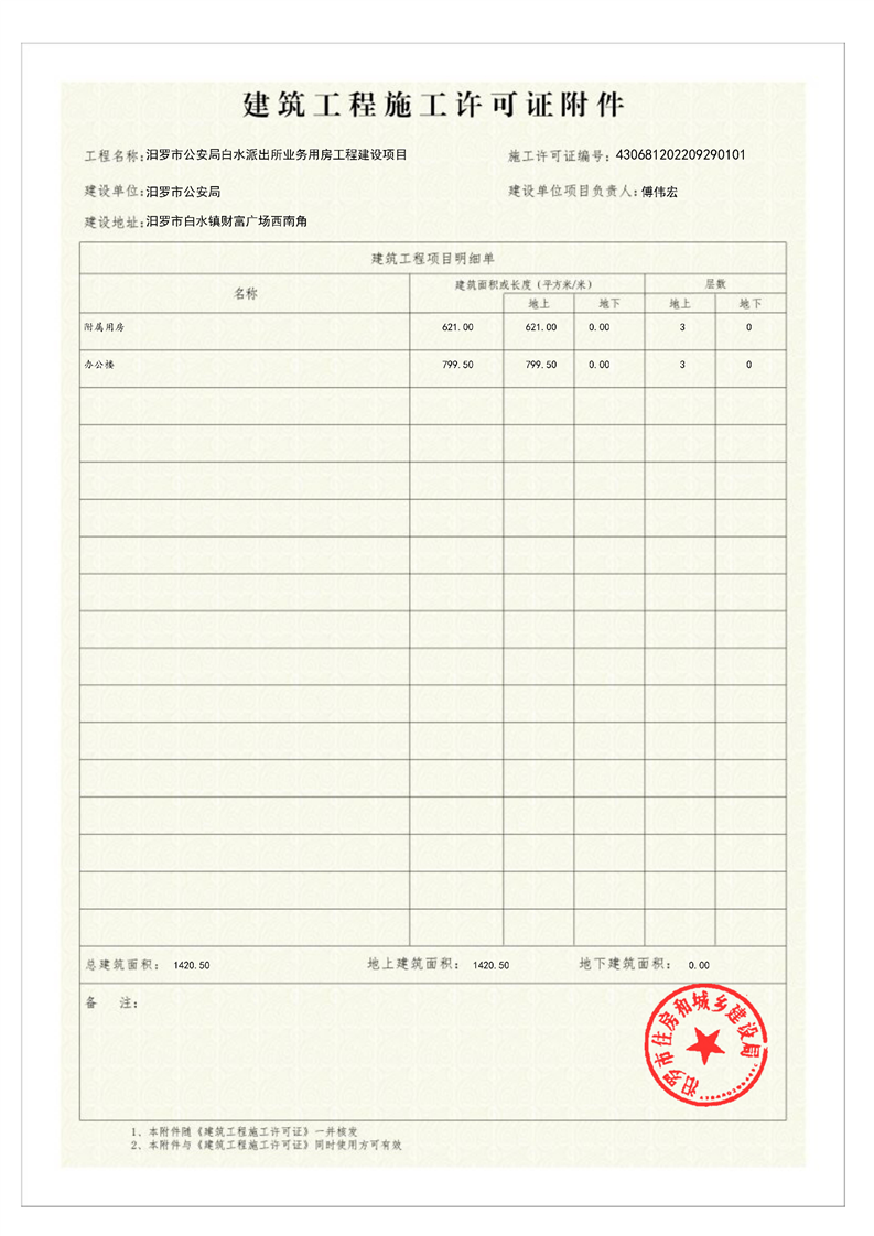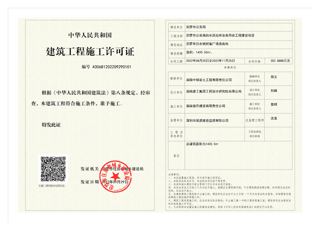 汨罗市公安局白水派出所业务用房工程建设项目施工许可证