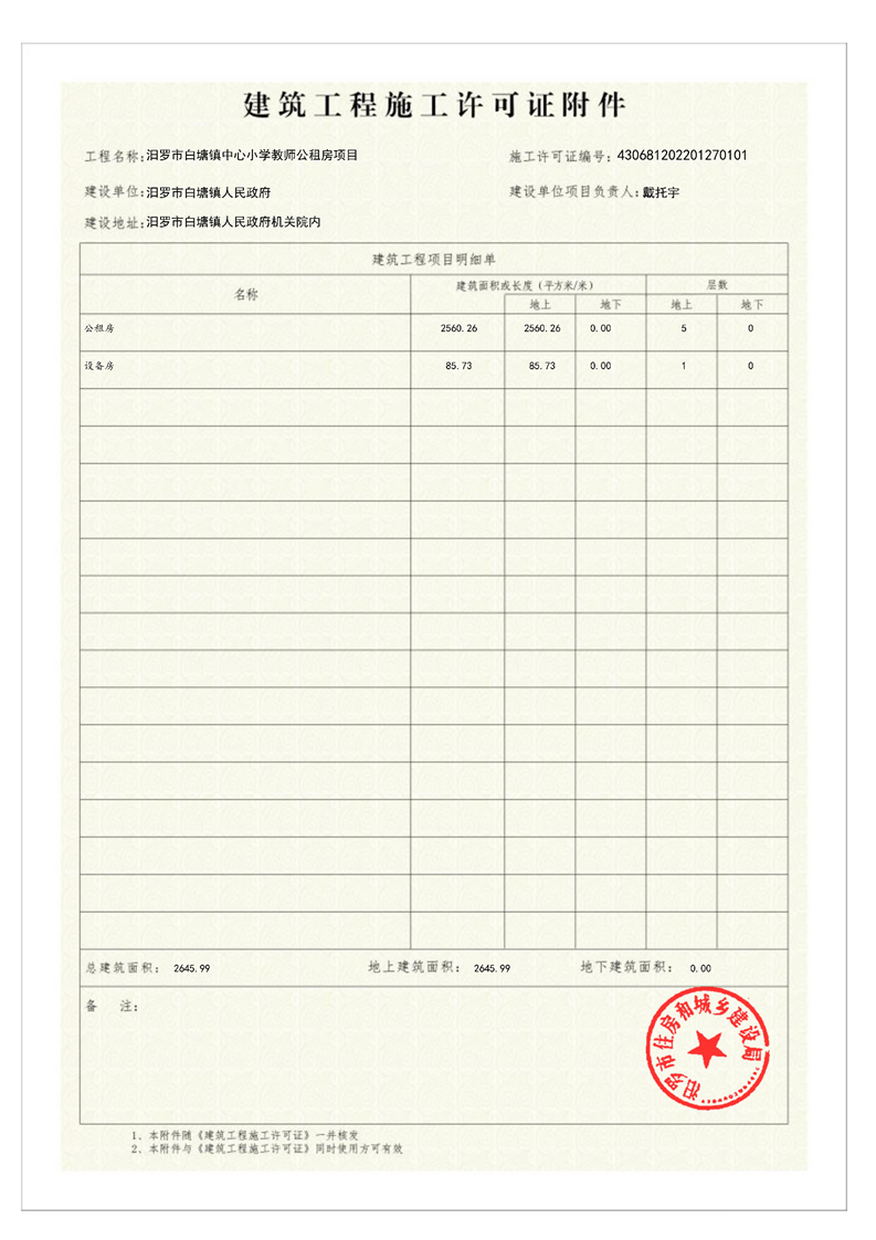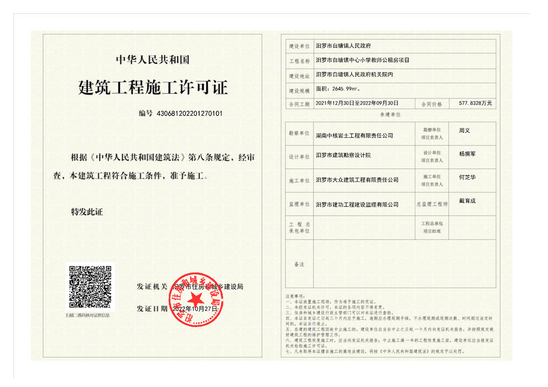 汨罗市白塘镇中心小学教师公租房项目施工许可证