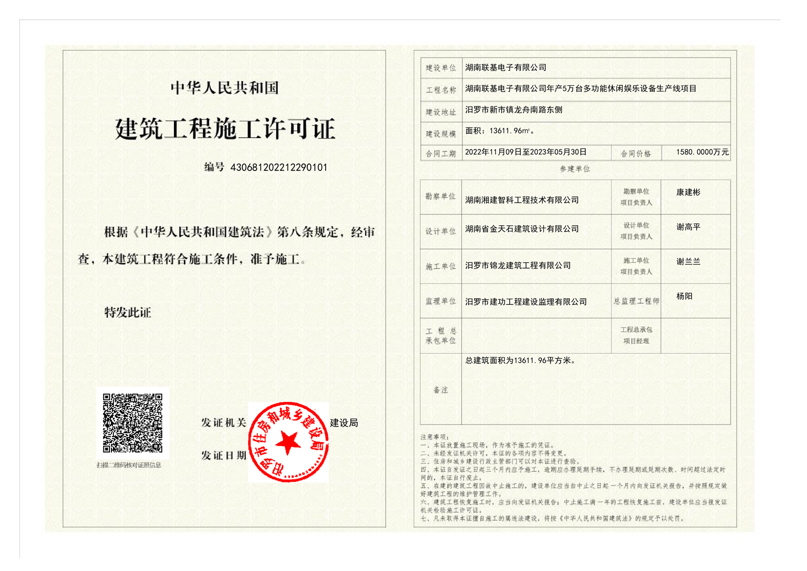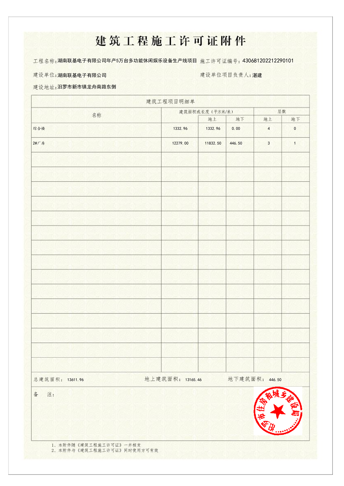 湖南联基电子有限公司年产5万台多功能休闲娱乐设备生产线项目施工许可证