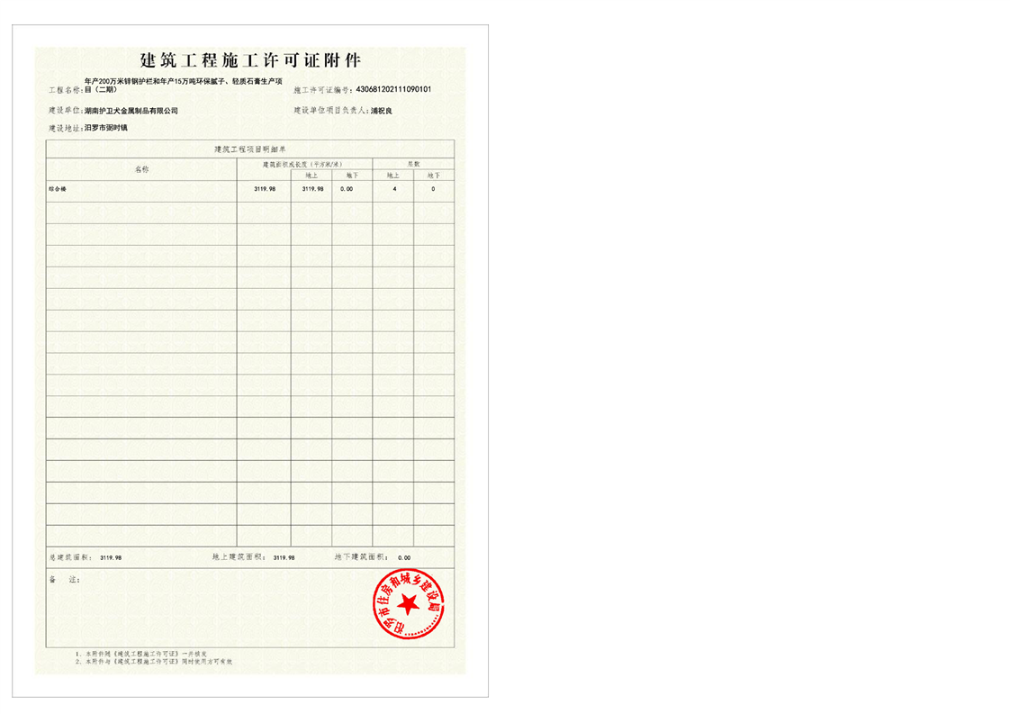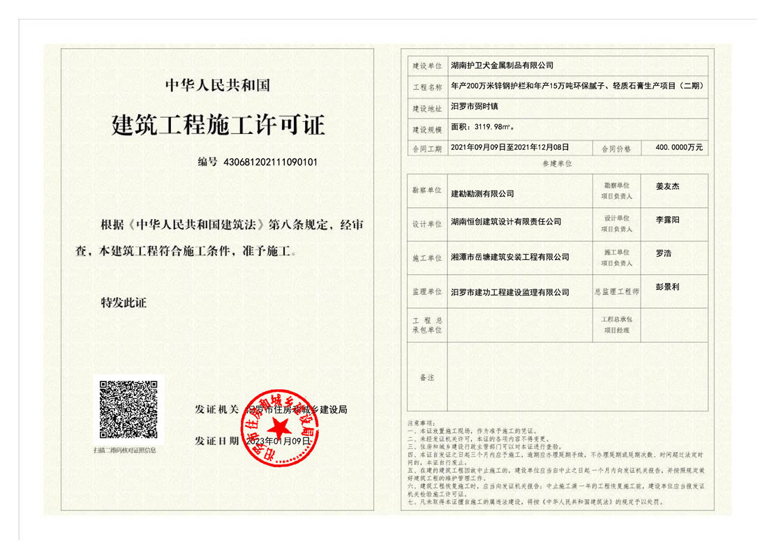 湖南护卫犬金属制品有限公司年产200万米锌钢护栏和年产15万吨环保腻子、轻质石膏生产项目(二期)施工许可证