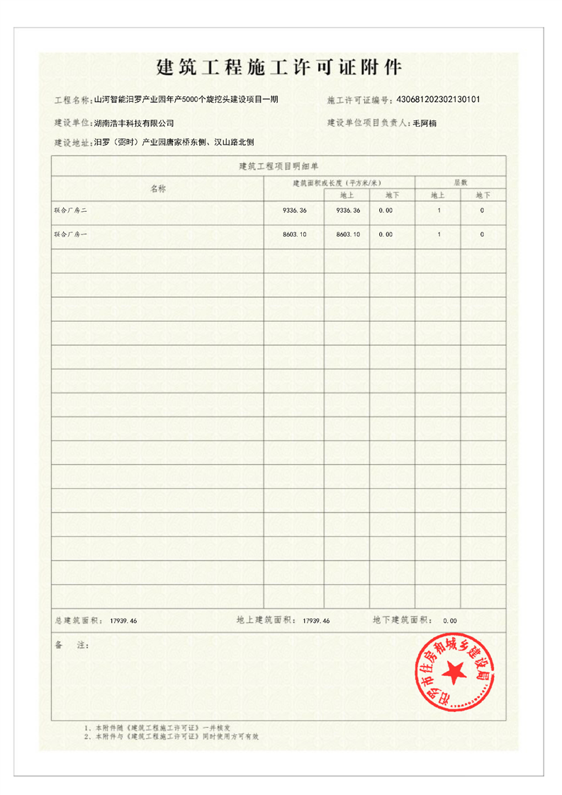 山河智能汨罗产业园年产5000个旋挖头建设项目一期施工许可证