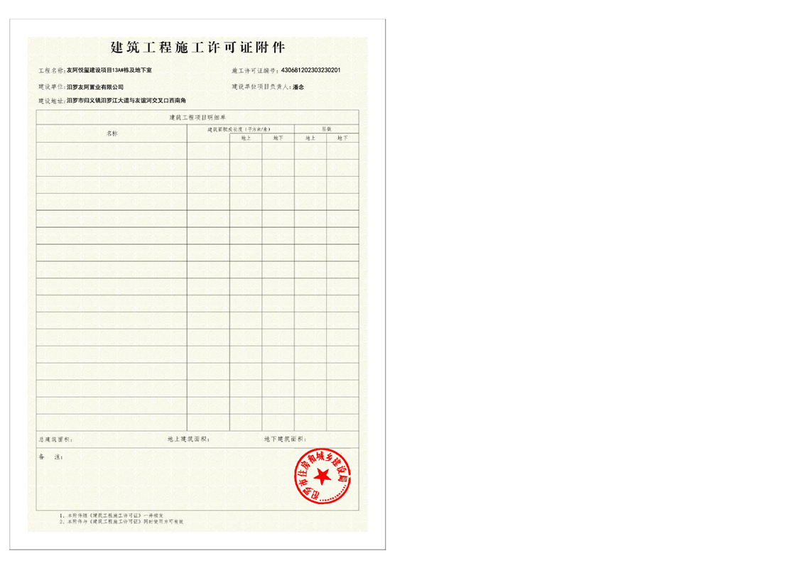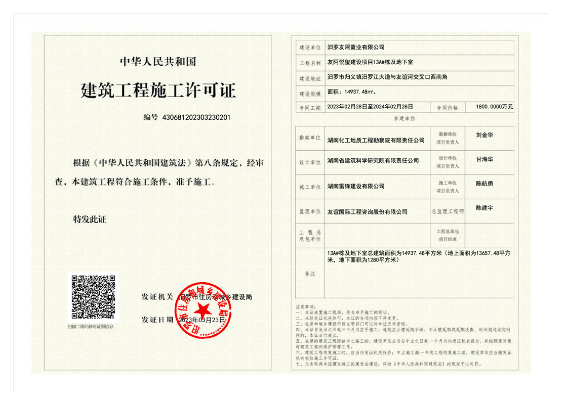 友阿悦玺建设项目13A#栋及地下室施工许可证