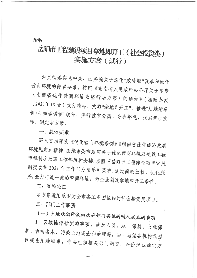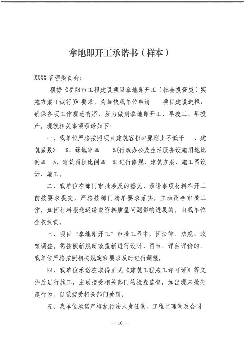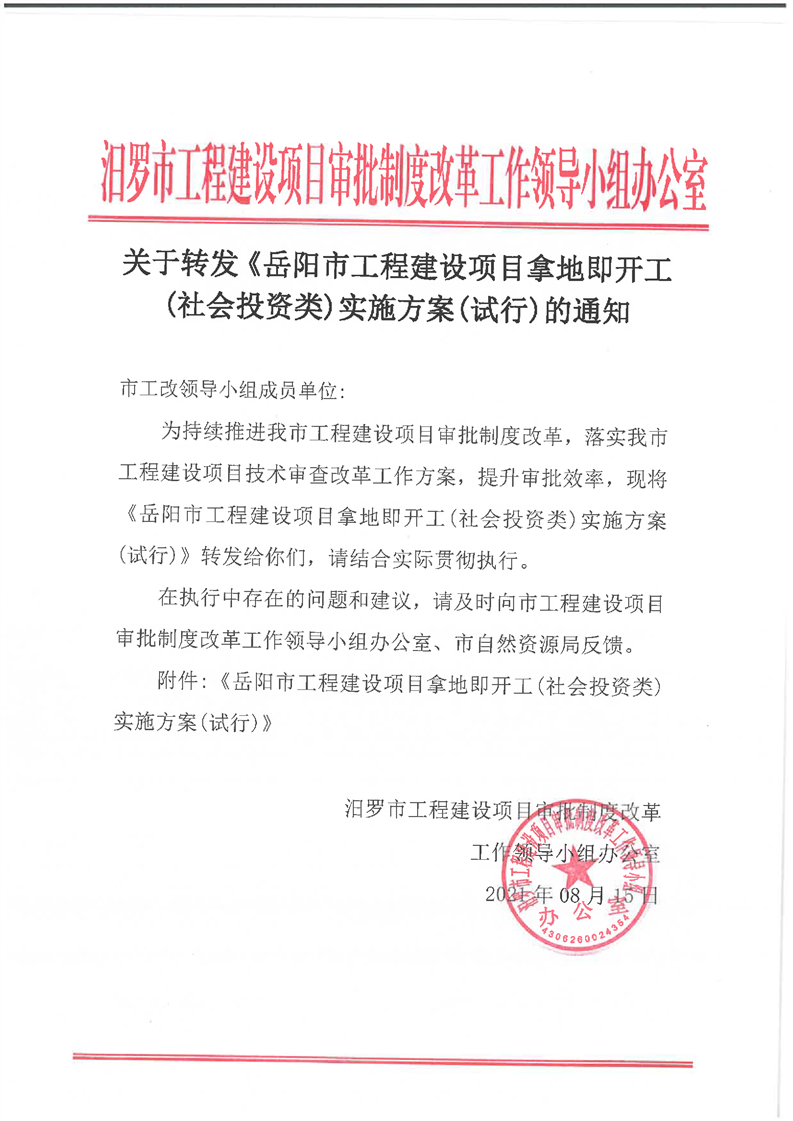 关于转发《岳阳市工程建设项目拿地即开工(社会投资类)实施方案(试行)的通知