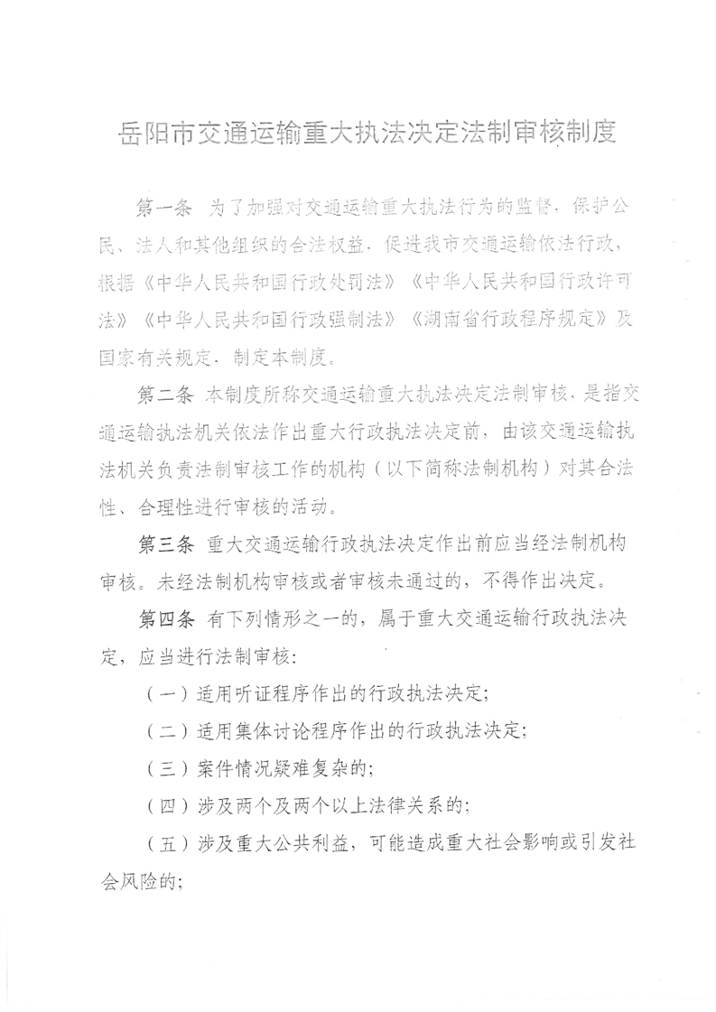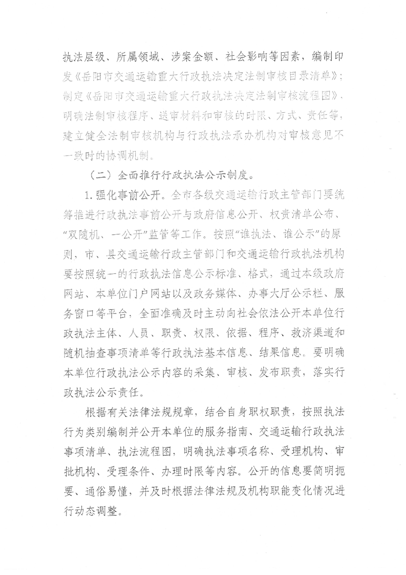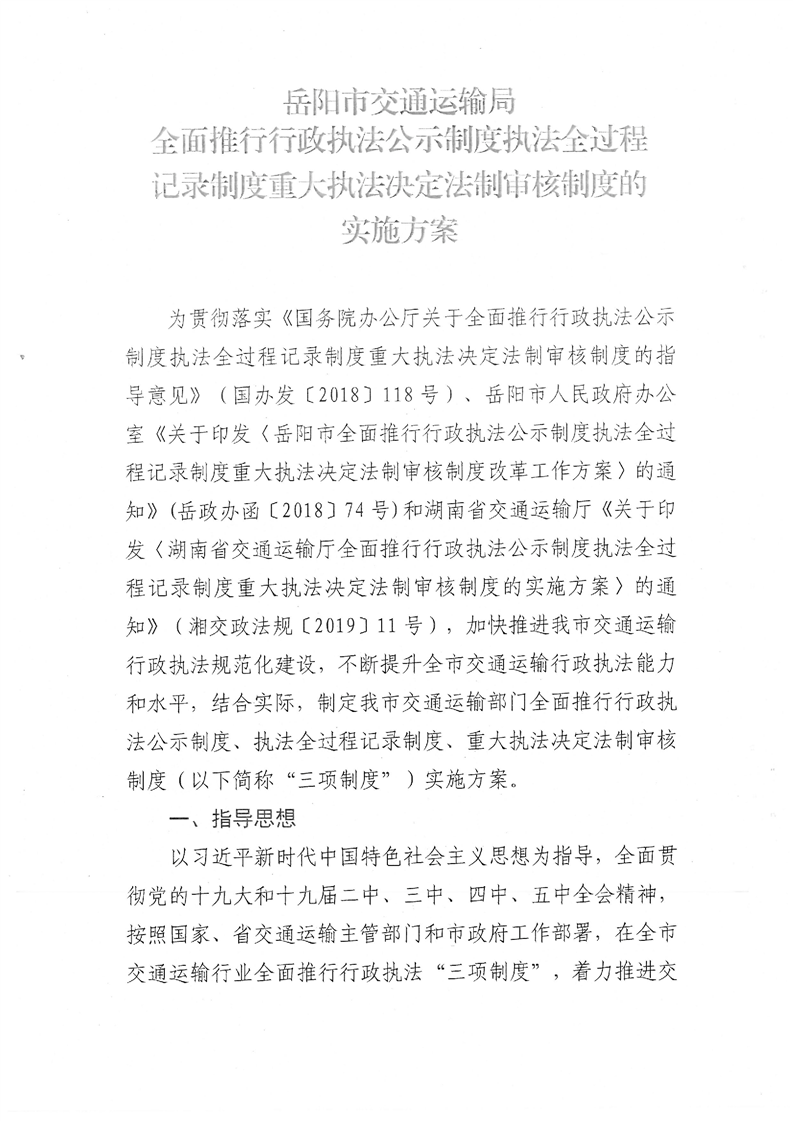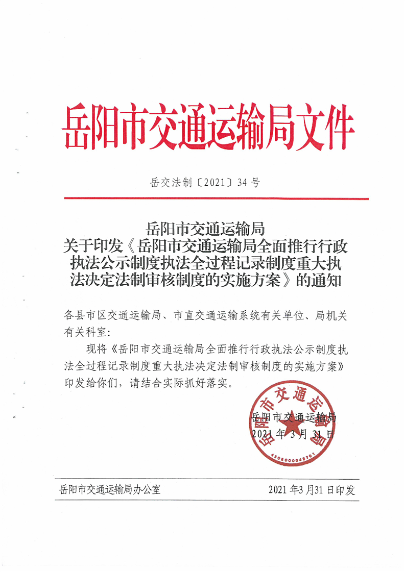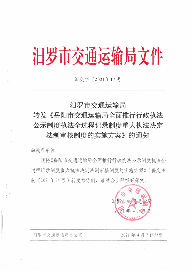 汨罗市交通运输局转发《岳阳市交通运输局全面推行行政执法公示制度执法全过程记录重大执法决定法制审核制度的实施方案》的通知