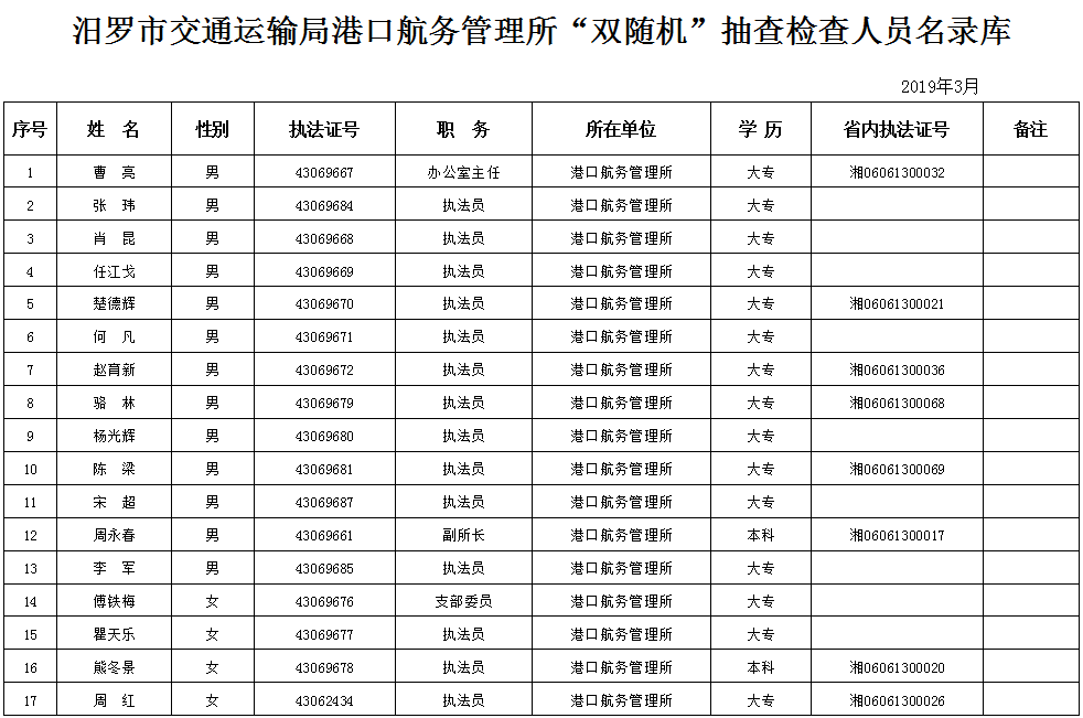 汨罗市交通运输局港口航务管理所“双随机”抽查检查人员名录库