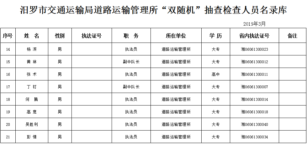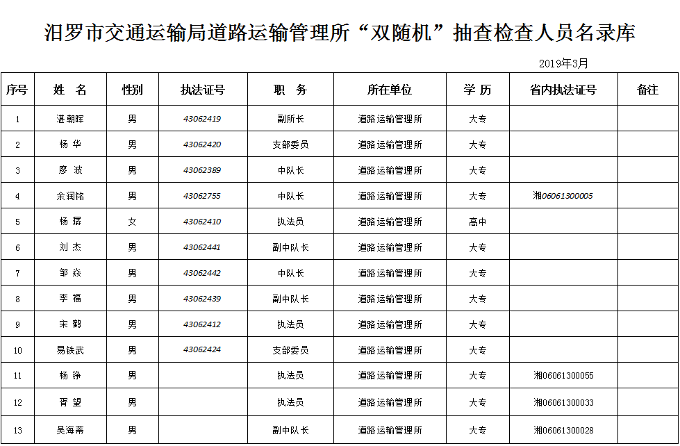 汨罗市交通运输局道路运输管理所“双随机”抽查检查人员名录库