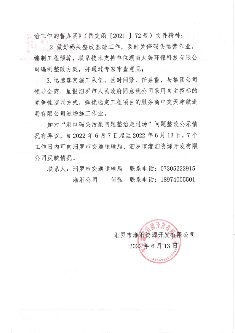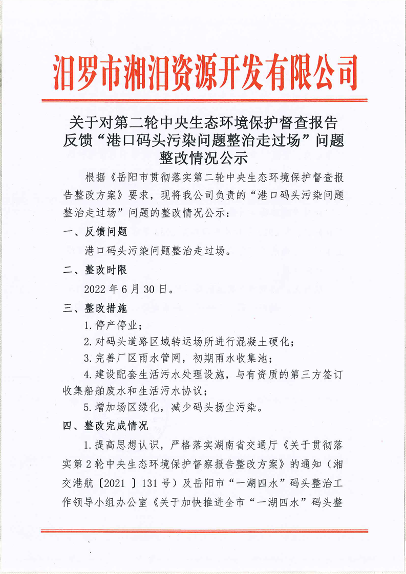关于对第二轮中央生态环境保护督查报告反馈“港口码头污染问题整治走过场”问题整改情况公示
