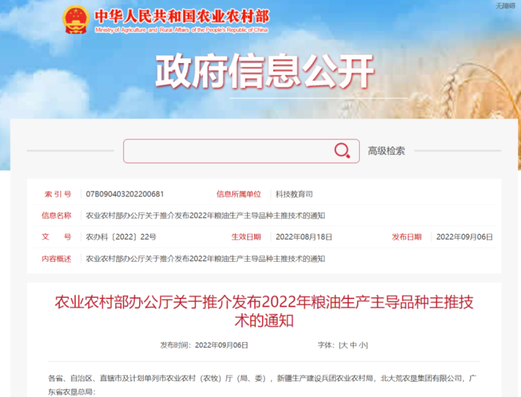 近日,农业农村部组织遴选了2022年粮油生产主导品种128个,主推技术114项,并发布《关于推介发布2022年粮油生产主导品种主推技术的通知》。
