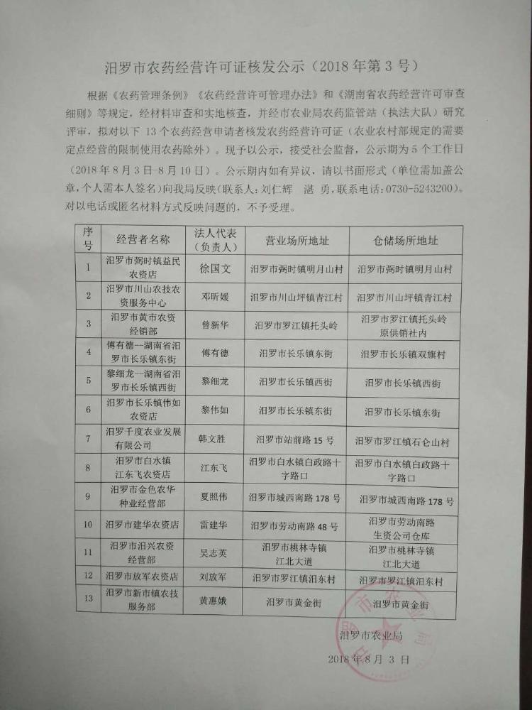 汨罗市农药经营许可证核发公示(2018年第3号)