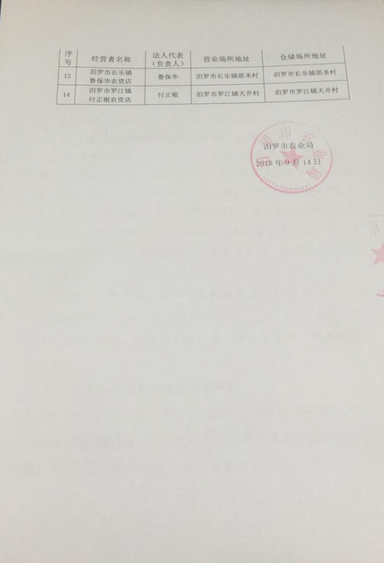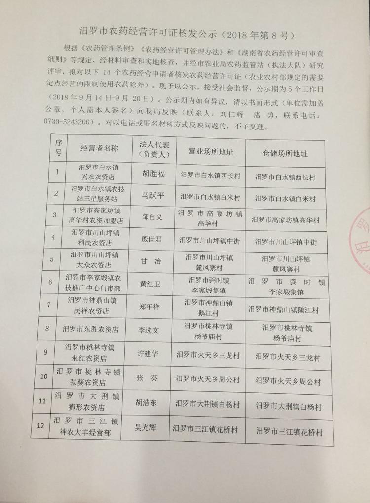 汨罗市农药经营许可证核发公示(2018年第8号)
