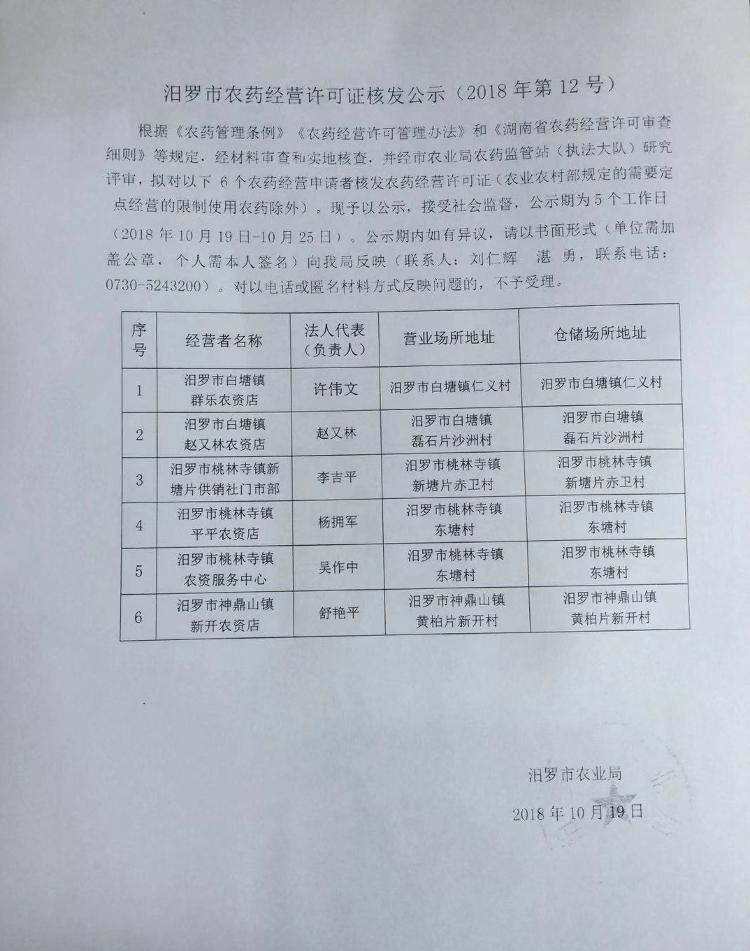 汨罗市农药经营许可证核发公示(2018年第12号)
