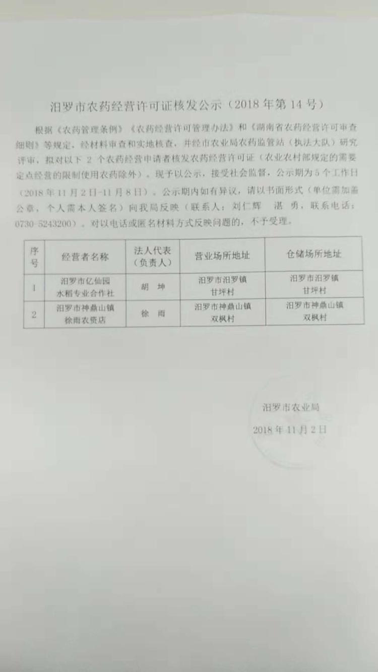 汨罗市农药经营许可证核发公示(2018年第14号)