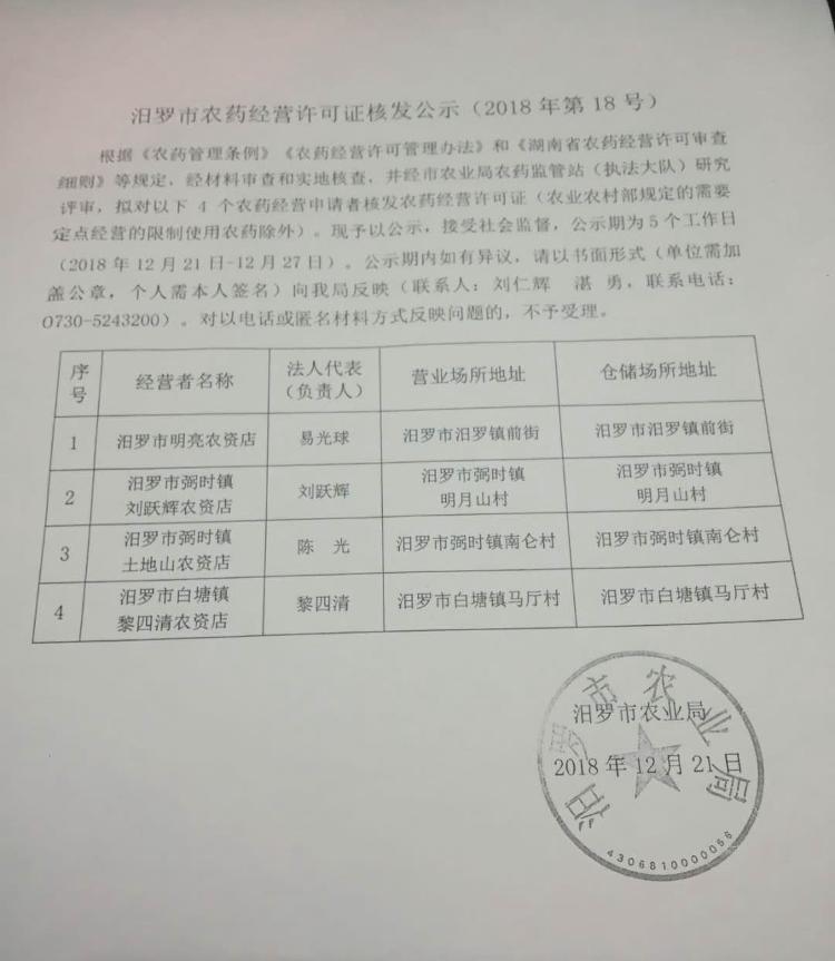 汨罗市农药经营许可证核发公示(2018年第18号)