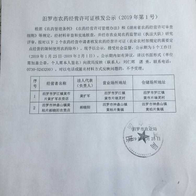 汨罗市农药经营许可证核发公示(2019年第1号)