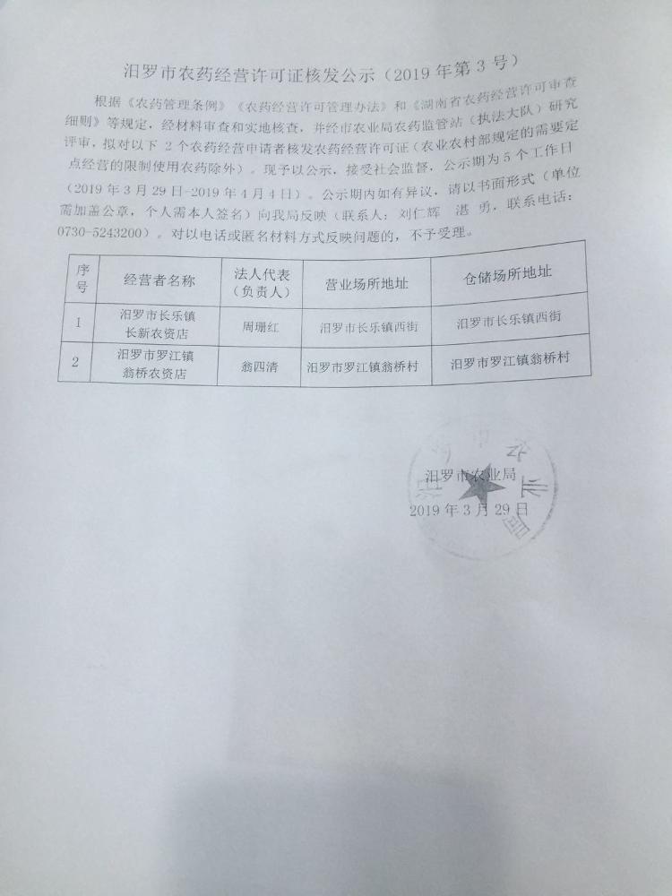 汨罗市农药经营许可证核发公示(2019年第3号)
