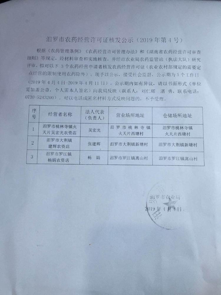 汨罗市农药经营许可证核发公示(2019年4号)