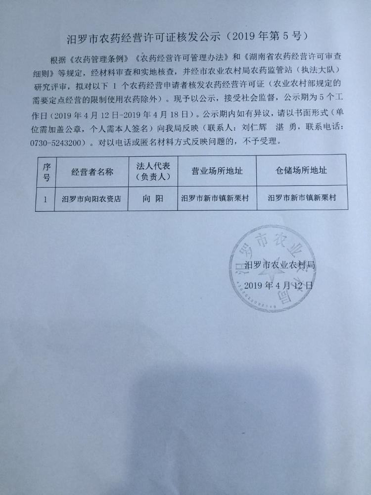 汨罗市农药经营许可证核发公示(2019年第5号)