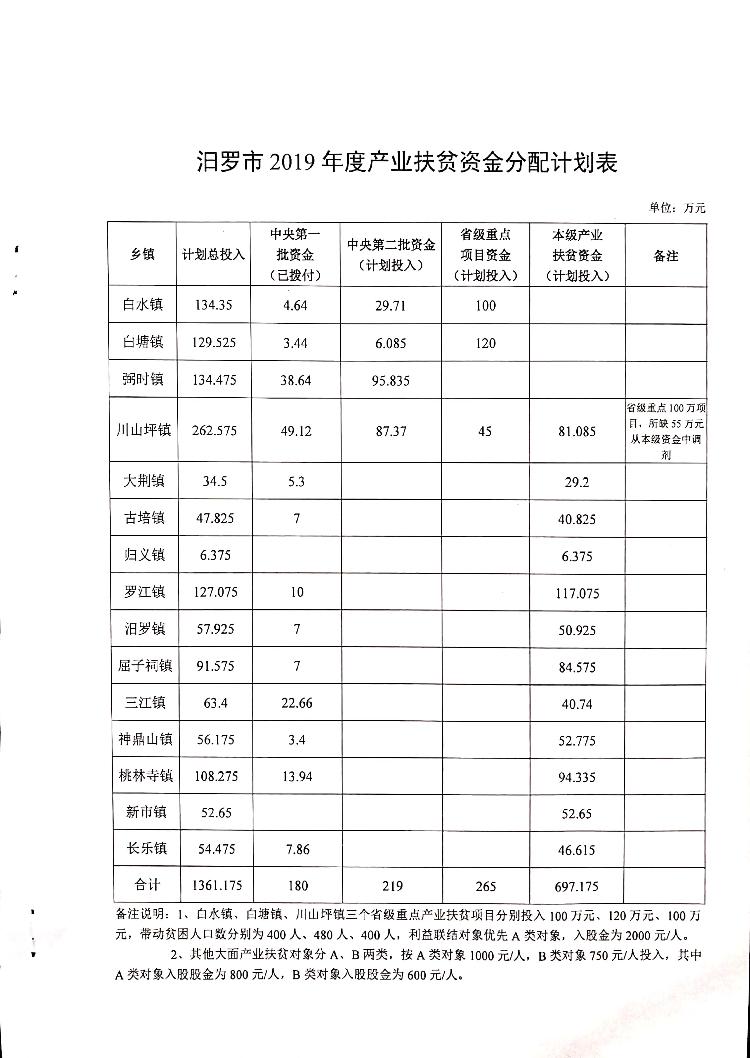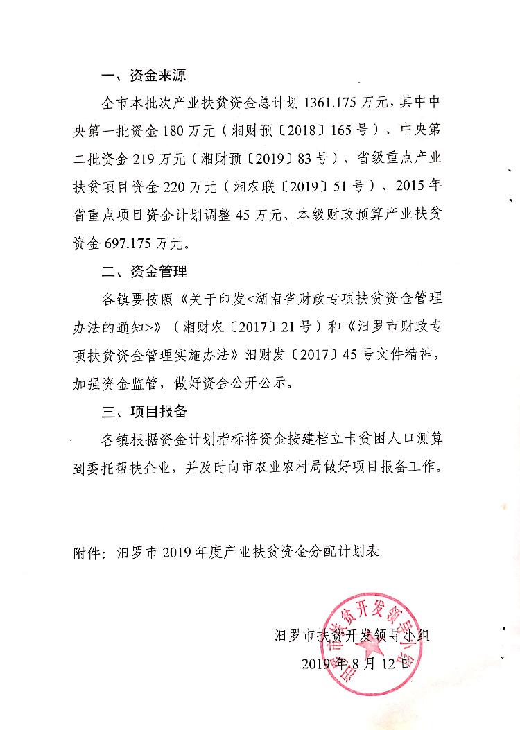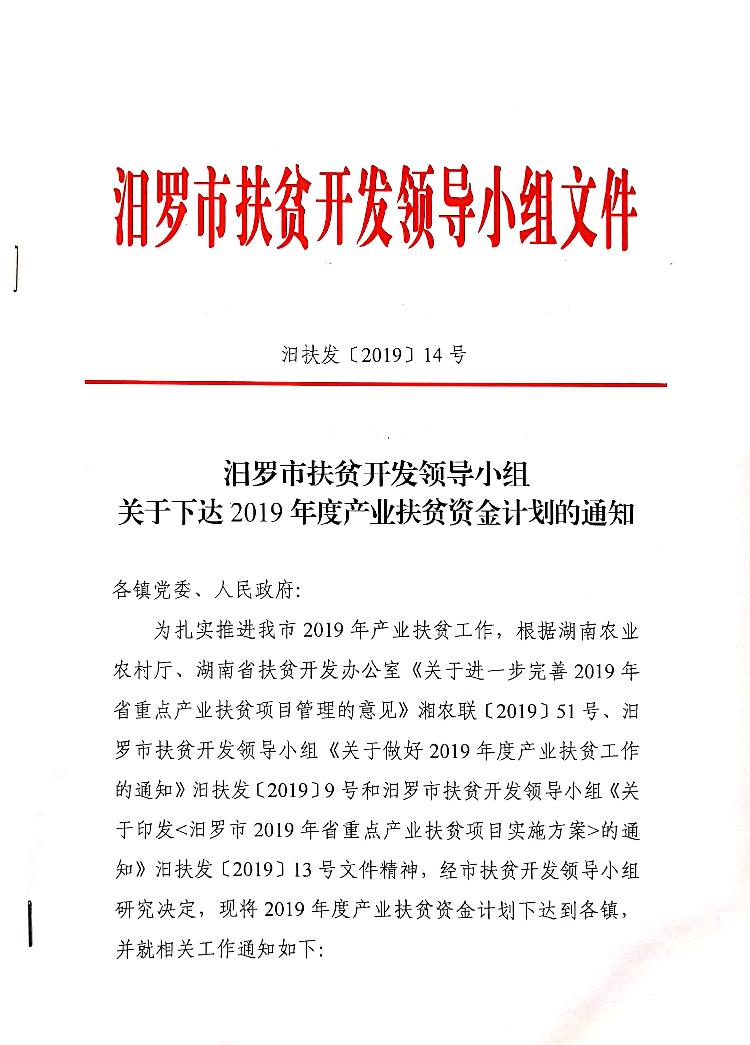 汨扶发〔2019〕14号关于下达2019年度产业扶贫资金计划的通知.docx
