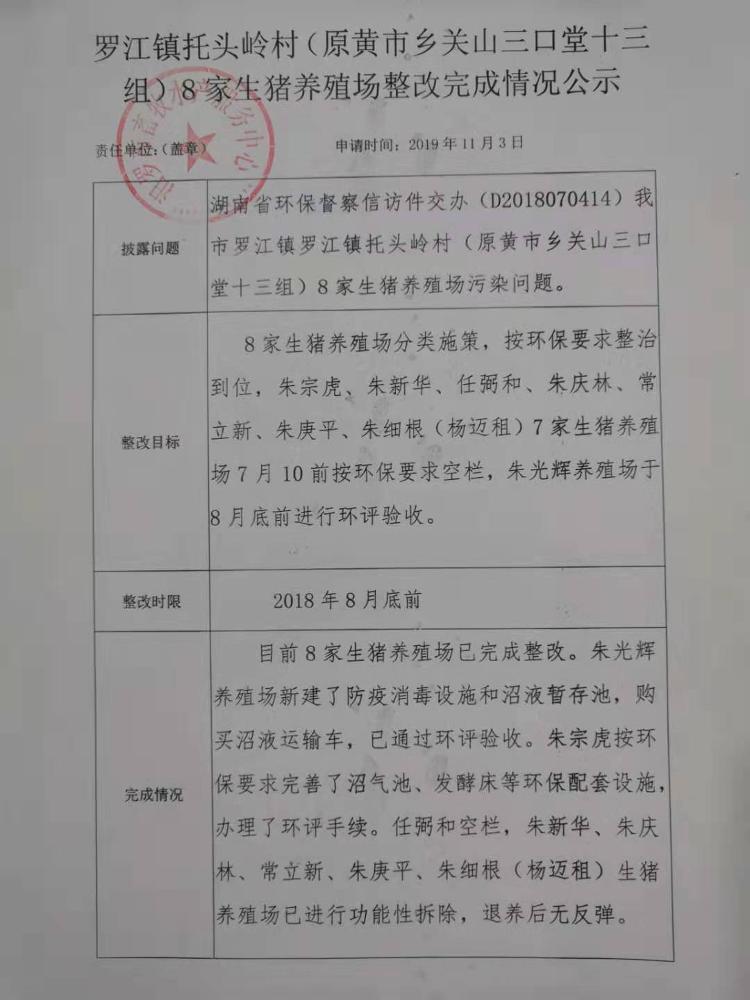 罗江镇托头岭村8家生猪养殖场整改完成情况公示