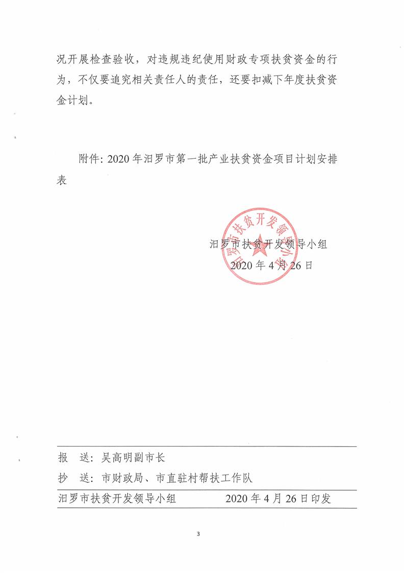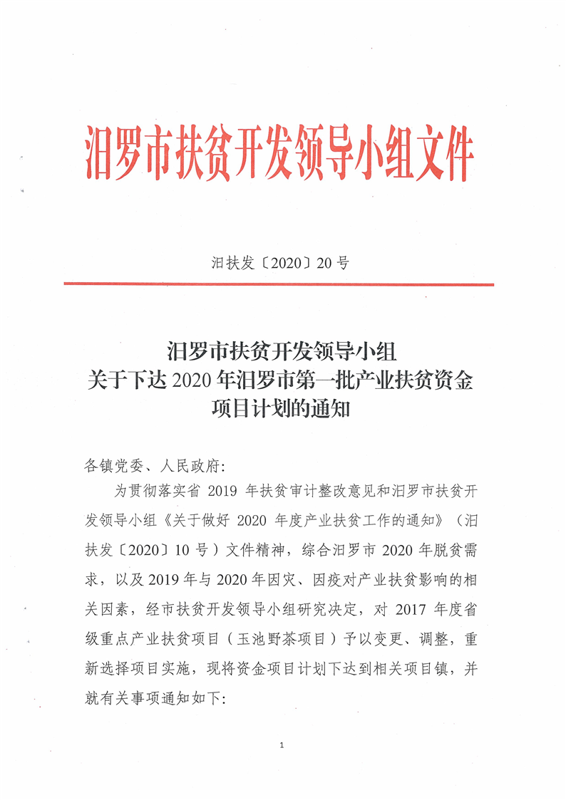 汨扶发【2020】20号汨罗市扶贫开发领导小组关于下达2020年汨罗市第一批产业扶贫资金项目计划的通知