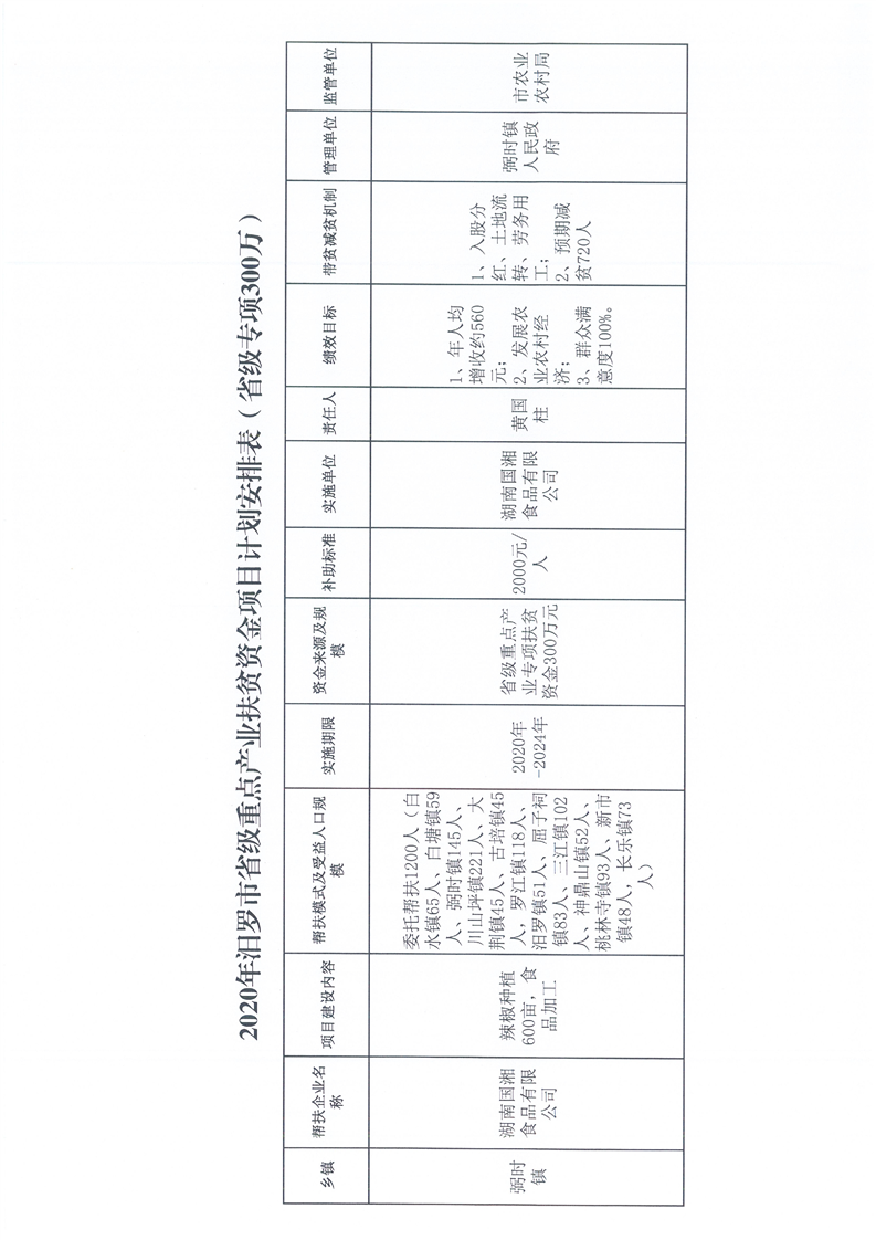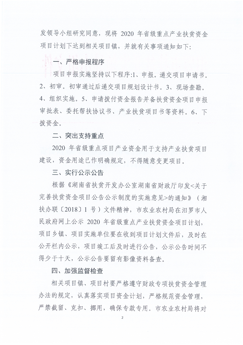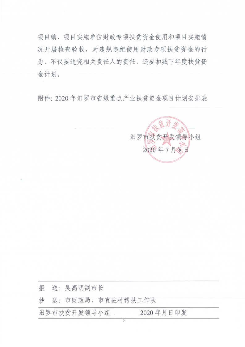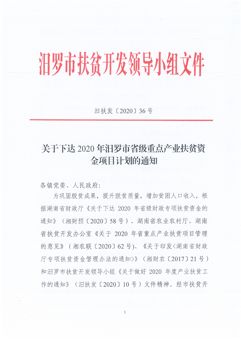 汨扶发【2020】36号关于下达2020年汨罗市重点产业扶贫资金项目计划的通知