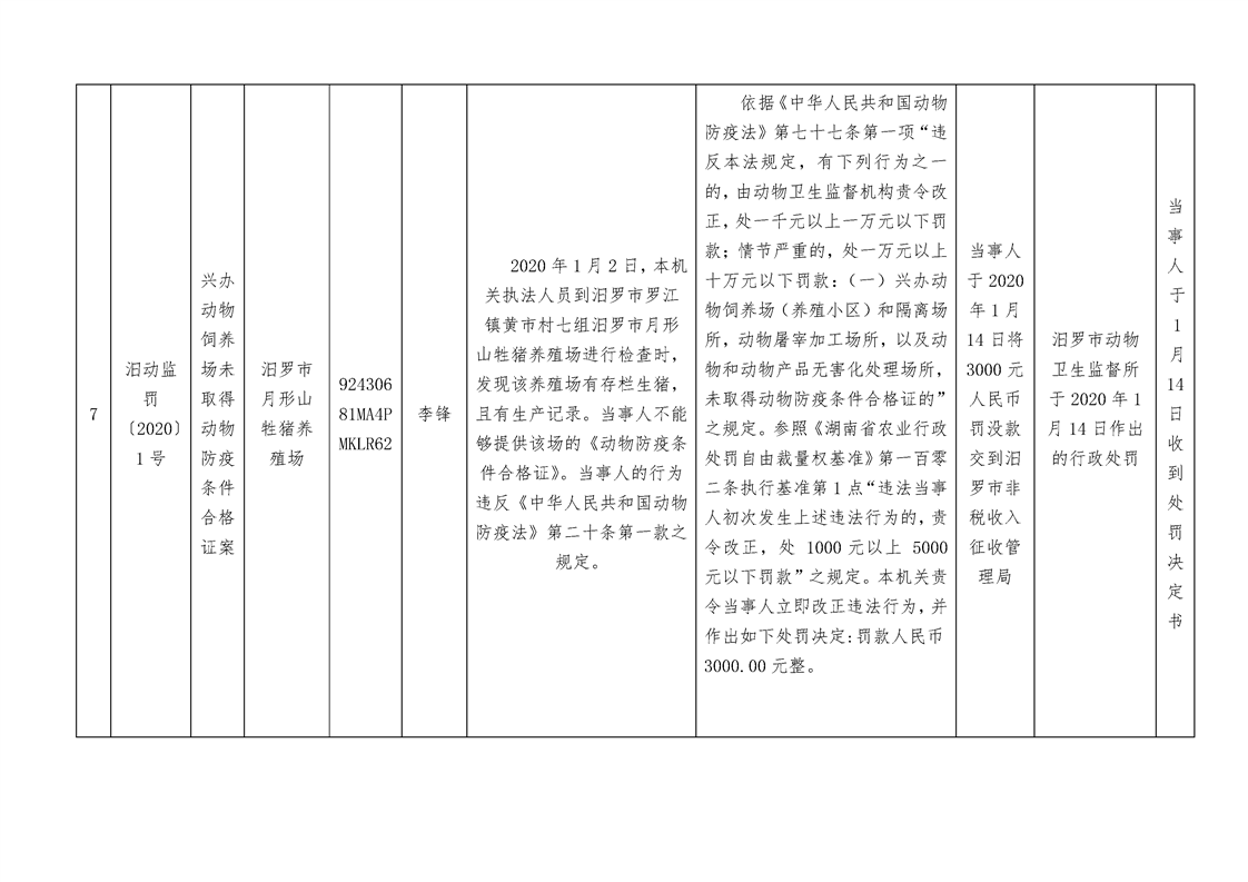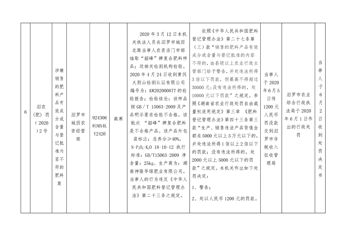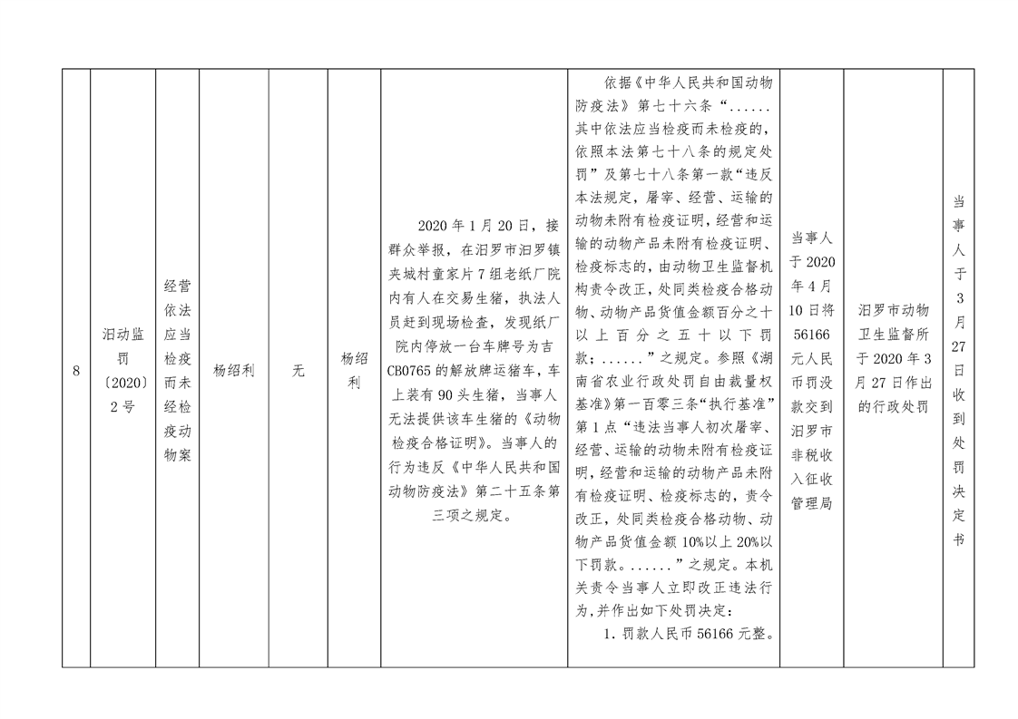 农业行政处罚案件信息公开表2020