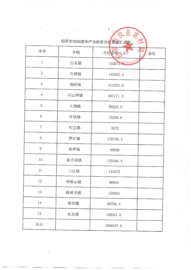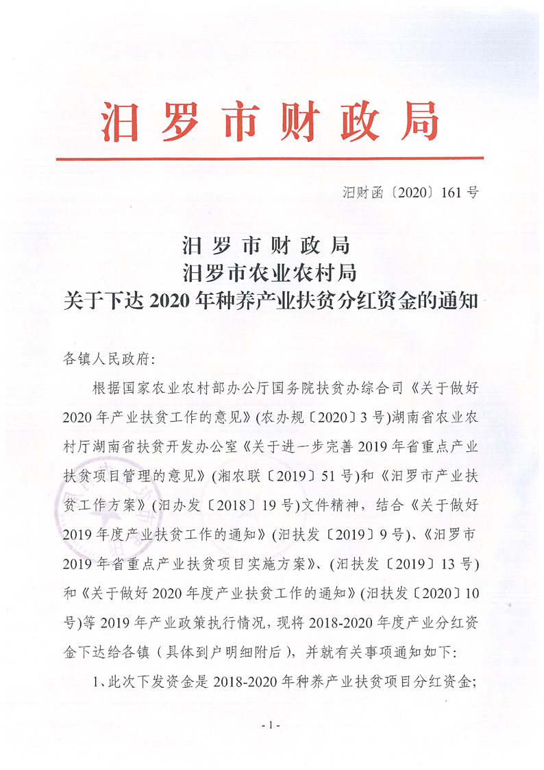 关于下达2020年种养产业扶贫分红资金的通知