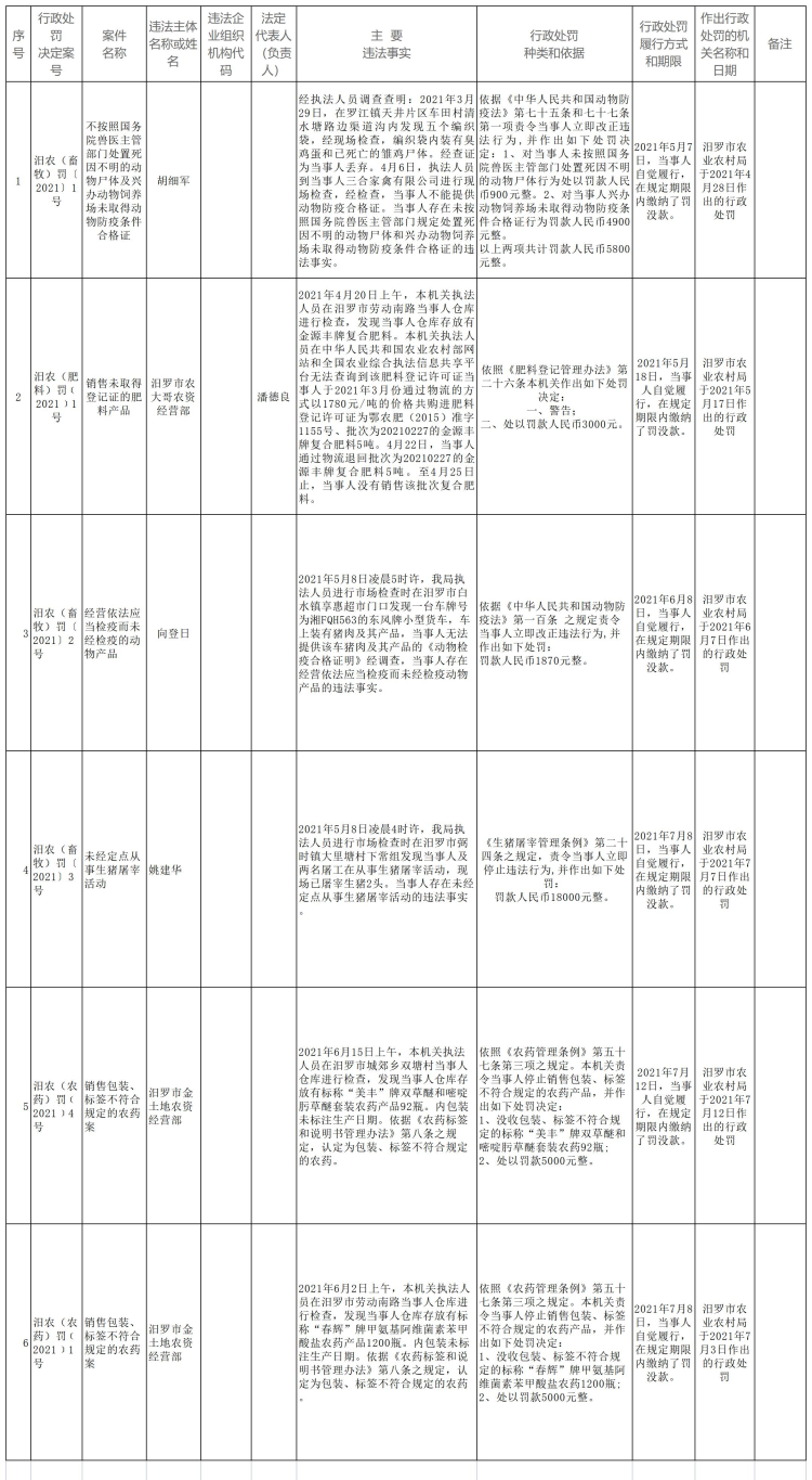 汨罗市农业农村局2021年上半年度行政处罚案件公示